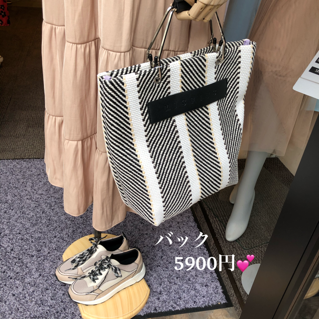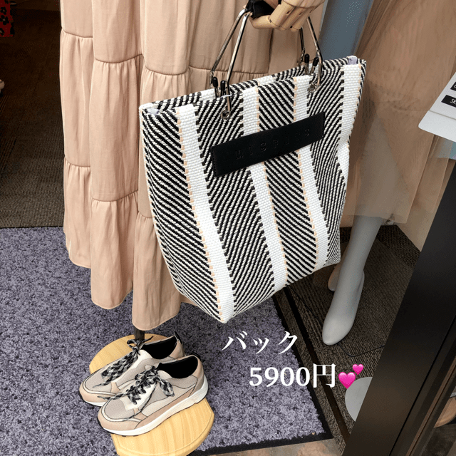 ストライプの手提げバック💕5900円 着こなしのポイントになるモノトーンの配色がお洒落な手提げバックはいかがでしょう? 黒のサンダルと合わせて、初夏のコーデのアクセントになります💕 軽さも魅力的です💕😃 2020年4月9日