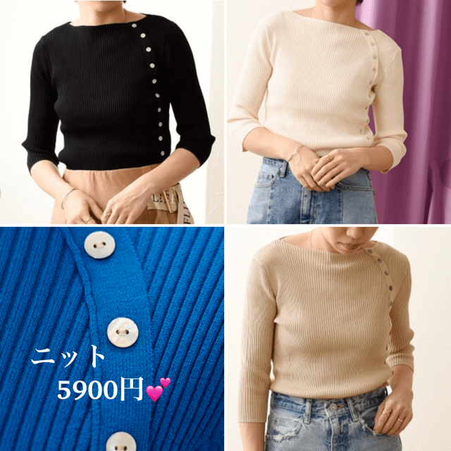 ボタンデザインニット💕5900円 お待たせしました💕 大人気のボタンデザインニットが初夏バージョンとなって到着しました💕 ネックラインはデコルテを綺麗に見せてくれるボートネックに変更されて、初夏にピッタリのシャリ感のある糸で作られました💕 シンプルなデザインですが縦に並んだボタンが、着こなしのアクセントに😃 お家でホームクリーニングOK🙆♀️です アイボリー、ページュ、ブルー、ブラックの4カラーとなっております 2020年4月14日