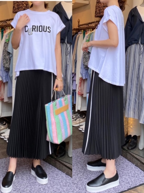 Tシャツ¥7200✨スカート¥11000 ✨ バックが長くなっているロゴTシャツに、プリーツロングスカートの、スポーティーなモノトーンスタイルはいかがでしょうか✨✨ 現在無料で配送も行っておりますのでお気軽にお問い合わせくださいませ🤗💕💕 Tシャツ¥7200 スカート¥11000 スニーカー¥6900 2020年4月27日