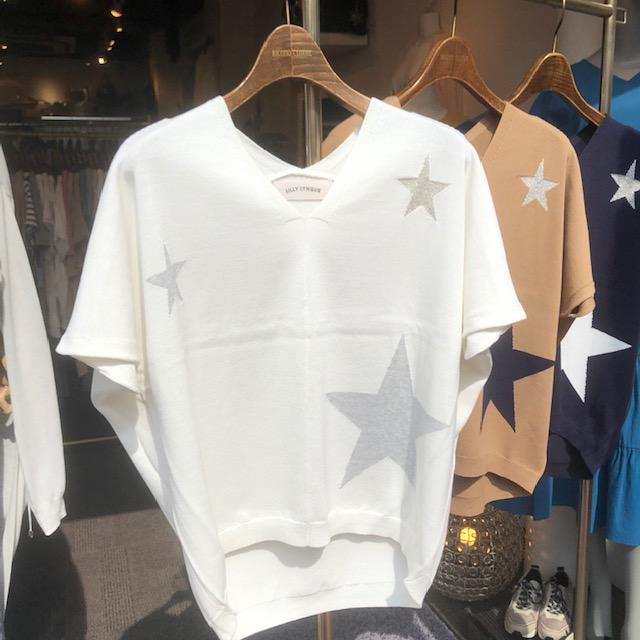 星ニット 12000円💕 コットン100%のサマーニットはいかがでしょうか? デニムやスカートなど、合わせるボトムスを選びません 上質なコットン100%の糸で編まれているので、サラッとした着心地⭐️⭐️⭐️ とってもお役立ちで快適なニットです💕 オフ白、キャメル、ネイビー の3カラーで展開しております 2020年5月30日