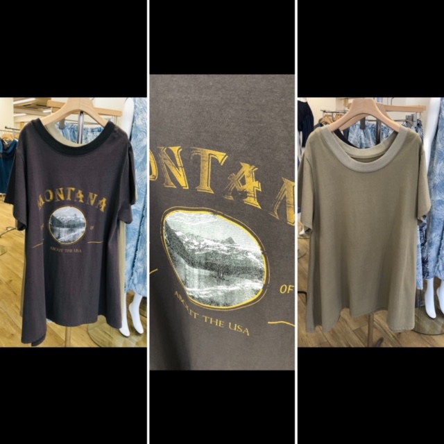 MontanaプリントTシャツ 7900円💕 かすれラバープリントのチュニックTシャツが到着しました💕😍 広めのネックラインでカジュアルな中にも女っぽさが光ります💕 お洒落なプリントのTシャツは、いち早くゲットしてくださいね💕💕💕 白、カーキ、ブラックの3カラーで到着しました🎉 2020年5月2日