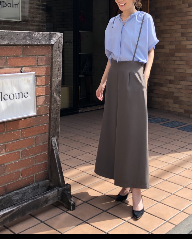 サロペットパンツ💕9800円 カーキのワイドパンツコーデはいかがでしょうか? サックスブルー のブラウスを合わせてパリジェンヌ風にアレンジしてみました💕 軽くてシワにならない、ポリエステル素材となっております💕 紐は、後ろで縛るタイプなので、どんな体型の方にも、ちゃんとすっきり着られます💕 パンツはブラックもございます ブラウス 8900円 coming soon💕 2020年5月2日