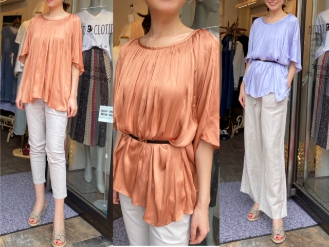 シャイニートップス¥6900💕 トレンドのシャイニー素材のトップスが入荷しております🧡 カラーは写真テラコッタ、パープル、グレージュ、ブラックもございます❣️ 付属のベルトでウエストマークすると、また違った表情になりますよ😊❤️ シャイニートップス¥6900 パンツ¥11800 ワイドパンツ¥11000 サンダル¥9500 2020年5月16日