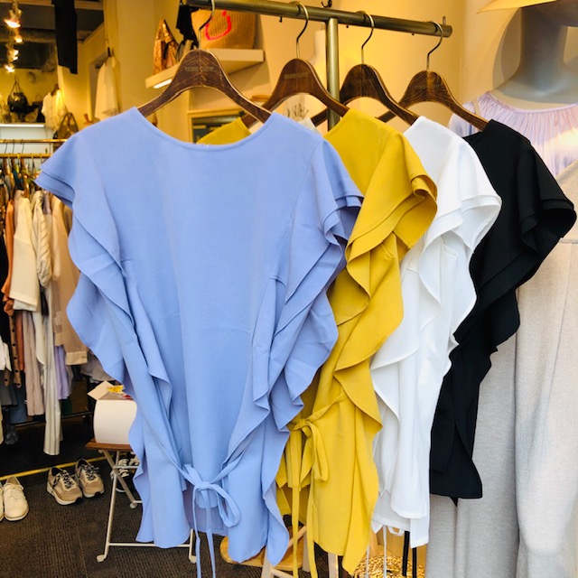肩フリルのブラウス💕6900円 たっぷりとしたフリルが腕まわりを優しくカバーしてくれる💕しなやかなブラウスがおすすめです シワになりにくいとろみ素材で、真夏も爽やかにお召しいただけます ラベンダーがかったすみれ色、マスタード、ホワイト、ブラックの4カラーとなっております💕💕💕 ウェストのリボンは、前後どちらで結んでも素敵です😍🙌 2020年5月25日