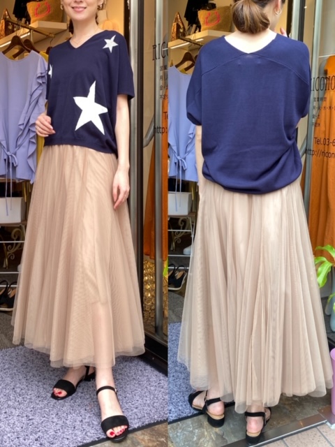 星のニット¥12000💕スカート¥11000💕 大人気⭐️星のニットにチュールスカートはいかがでしょうか✨ ニットは、ほどよいVネックで首元がすっきり見え、二の腕もしっかり隠れます💕 星のニット¥12000 スカート¥11000 2020年5月27日