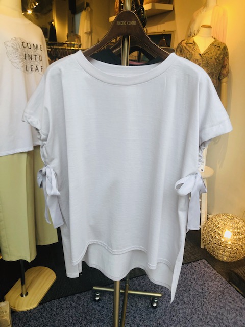 デザインTシャツ 7900円💕10%オフ🎉🎉🎉 お袖のアーム周りをリボンで変えられる🎀お洒落なTシャツが入荷しました💕 少しだけバックテールで、パンツでもスカートでもスッキリとしたシルエットでお召しいただけます😃🙌 7900円→7110円💕😍 一枚のみの入荷でーす 2020年5月27日