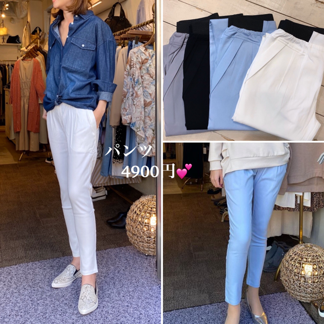 ストレッチ美脚パンツ💕4900円🎉 抜群の伸縮でファンがいっぱいのハイテンション美脚パンツが到着しました💕 爽やかな白、新鮮なブルー、やっぱり使えるグレーとブラックの4カラーです S.M.Lの3サイズで展開しております💕😃🙌 送料無料でご配送させて頂きます ご注文はお気軽にですーー 2020年5月5日