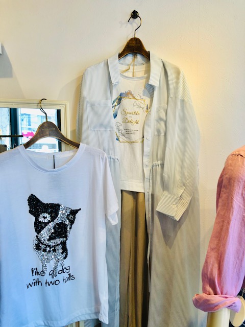 白Tシャツ❎ベージュパンツ❎ストライプワンピース 今年は透け感のあるシアーな素材の羽織りを一枚揃えるとお役立ちです💕 こんなストライプ柄のワンピースなら更におしゃれ💕💕💕 サックスブルー と白の2カラーで展開しております ワンピース 8900円 Tシャツ 4900円 パンツ 9800円 2020年6月9日