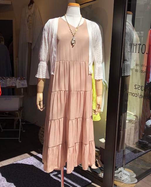 ティアードワンピース ベージュ💕 ポリエステル素材のティアードワンピース が大人気です💕 こちらは着丈が長すぎないので、小柄な方にもお薦めの一枚 お色違いはカーキとターコイズブルーがございます💕 ワンピース 14000円💕 カーディガン 9900円💕 2020年6月11日