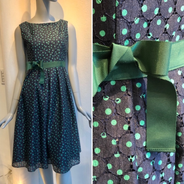 ドットレースのワンピース💕 シックなネイビー❎グリーンのドットプリントを上質なレース生地に施したとっても品のあるワンピースはいかがでしょう? ヒロインになれる一枚です💕💕💕 リボンはブローチなので取り外してお使いいただけます💕 ワンピース 21000円💕 Mサイズのみとなります 2020年6月12日
