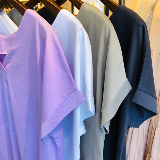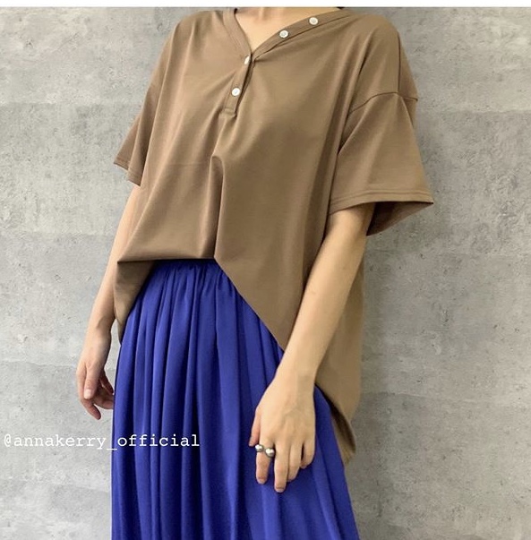 ヘンリーネックのTシャツ💕 スッキリしたVネックのTシャツが大人気です💕 今年人気のロイヤルブルーのスカートに合わせて、こんなブラウンもオススメです😍 こちらのブログを見てご来店のお客様に30%オフにて販売させて頂きます💕💕💕 Tシャツ 7900円→5530円💕 ラスト一枚です 気になる方は店頭までご連絡下さい💕 2020年6月13日