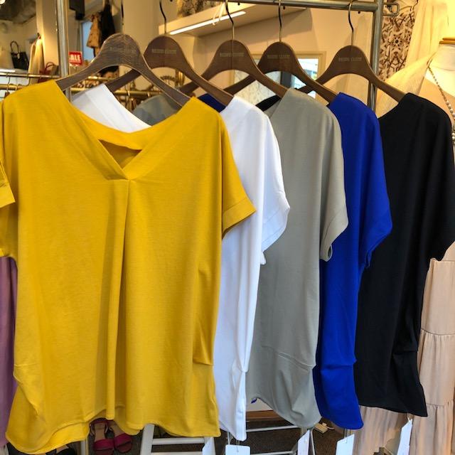 コットン100% VネックTシャツ💕 艶のあるバイオシルケット加工を施した上質なデザイントップスが入荷しました💕 やっぱり使えるシンプルTシャツ 少し広めのVネックとウエストをスッキリ見せてくれるタックがポイント💕💕💕 白、マスタード、カーキ、ベージュ、ロイヤルブルー、ブラック、ピンクなど、 7カラーで勢揃いいたしましたーーー💕😃🙌 Vネックデザイントップス 5900円💕 2020年6月13日