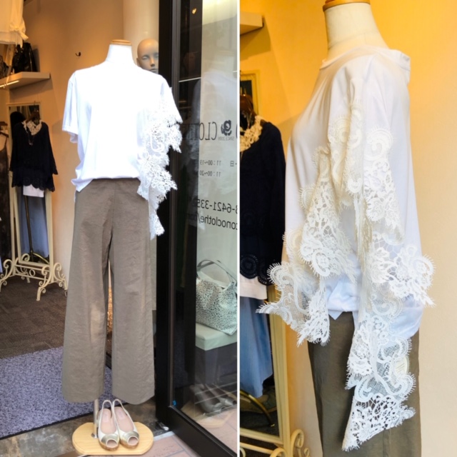 サイドレース デザインTシャツ💕 シンプルなTシャツはコットン100%の上質な生地💕 洗ってもヨレない、しなやかなレースをふんだんに使ったデザインが素敵です シンプルでエッジの効いたスタイリングをいかがでしょうか? Tシャツ 8500円 リネンストレッチパンツ 15000円 26日から先行SALEで販売致します⭐️⭐️⭐️ 2020年6月25日