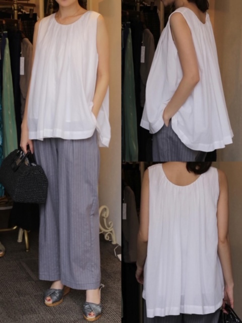 柔らかい風合いのノースリーブトップスに、爽やかなストライプのワイドパンツを合わせてみました✨