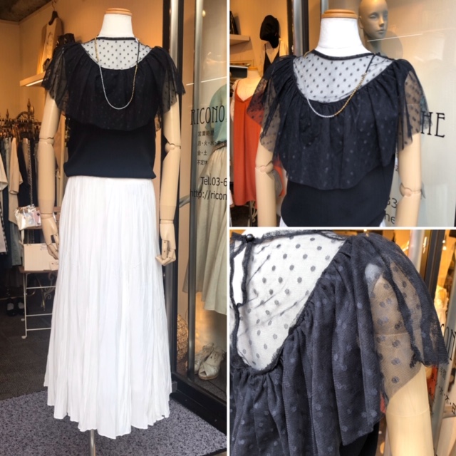 ドット❎チュールニット💕 たっぷりとしたチュールのフリルが可愛いニットトップスはいかがでしょうか? スカートやパンツはもちろん、キャミワンピースのインナーとしてもお使いいただけます💕 今から秋までずっとお使い頂ける万能アイテムですよん💕 ドット❎チュールニット 10000円→ SALE 8000円💕 お色違いは白がございます 2020年7月5日