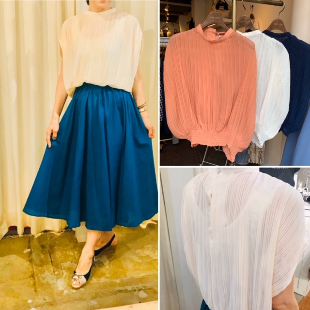 プリーツシフォンブラウス💕4900円 綺麗なプリーツシフォンのブラウスが到着しました💕 アイボリー、ピンク、ブラックの3カラーとなっております💕 ポリエステル100% ホームクリーニングOK🙆♀️ チョイスタンドカラーで旬のバランスをお楽しみくださいませ💕 スカート 7900円→7110円💕 2020年7月5日