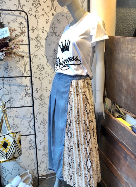 デニム❎パイソンプリーツ デニムとパイソンプリントのプリーツをドッキングしたお洒落なスカートが到着しております💕 巻きスカートタイプで、裾にもボタンが付いていて、風が吹いても広がらないようになっています⭐️⭐️⭐️ ビジューTシャツも20%オフ🎉🎉🎉ですよん Tシャツ 5120円 スカート 14800円 2020年7月8日