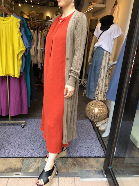 レース編みのロングカーディガン💕 さらっとした肌触りが嬉しいロングカーディガンが再入荷致しました💕 こんなビビットな赤いワンピースにも、カーキ色ならしっくりと馴染みます😍 秋まで大活躍しそうです カーディガン 13000円→9100円💕 ワンピース 9800円→7840円💕 2020年7月9日