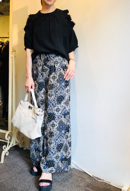 肩フラワーのトップス❎ペイズリーパンツ 今日入荷しましたペイズリーのワイドパンツ と、リコノオリジナル肩花のブラウスをコーディネートしてみました💕 ちょこっと肌見せが女らしくて人気のブラウスは薄手のポリエステル素材なのでとっても涼しくてお手入れも楽チンです💕 肩花ブラウス 6900円💕 ペイズリーワイドパンツ SALE 9100円💕 2020年7月11日