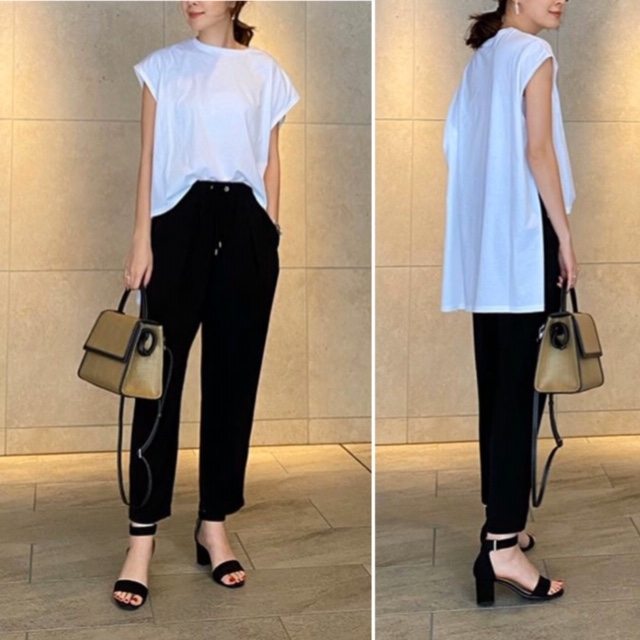 前後差トップス 4830円💕 シンプルな前後差のあるトップスとブラックパンツのコーディネート💕 白のサンプルTシャツも、前後差なら今年らしい旬の顔になりますよ 白Tはやはり一枚は揃えておきたい⭐️⭐️⭐️ コットン100%の素材感も嬉しい 2020年7月16日