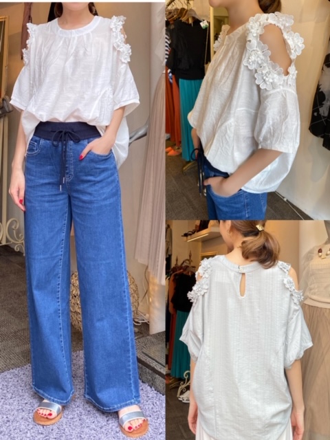 フラワーモチーフ肩あきトップス¥6900 💕デニム¥14800💕