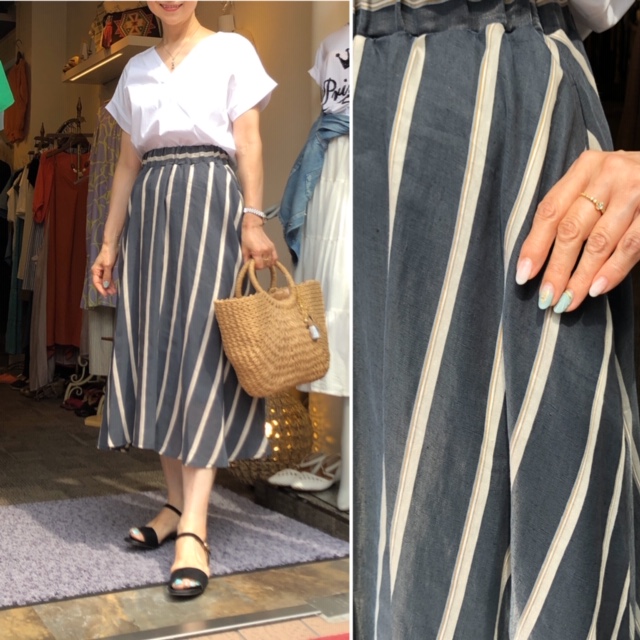 マルチストライプスカート💕一点のみ 艶のある上質なリネン素材のフレアスカートを買い付けました💕 今回は大変お買い求めやすい価格で販売スタートです こちらのチャコールグレー❎イエローの他に、マスタードカラーの無地も入荷致しました。 ぜひ見にいらしたくださいませーーーー スカート 16000円→9600円😍💕 Tシャツ 5900円→2950円💕💕💕 2020年8月7日