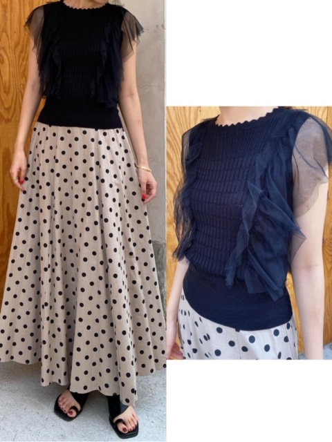 レース編みのニットと華やかなチュール袖のドッキングトップス💕