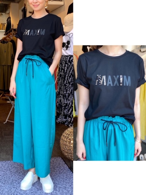英字とビジューのコンビネーションが可愛いロゴTシャツに、ワイドなシルエットで履き心地抜群のパンツ💕💕