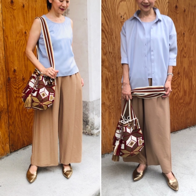 アンサンブル💕4900円💕 こちらはノースリーブのトップスとビックシルエットシャツのアンサンブルです💕 秋の特別価格アイテムです サックスブルー とキャメルカラーの色合わせは、少し秋を感じる爽やかコーデ💕😃 ソフトカラーの組み合わせなので、引き締めにインパクトのあるモチラバックを合わせてみました💕 まだまだ暑い残暑を爽やかにお過ごし下さいね💕 ワイドパンツ 9800円→4900円💕 フリーサイズ 2020年8月23日