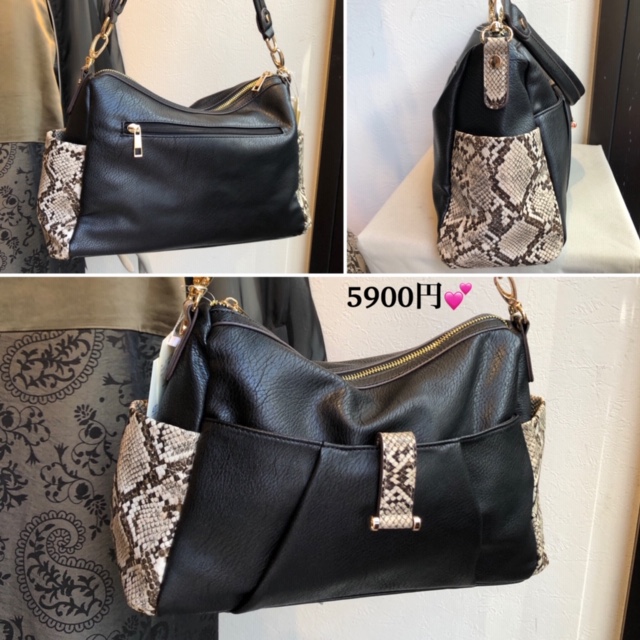 ブラック❎パイソン ショルダーバック ブラックとパイソンのコンビネーションがお洒落なワンショルダーバックが到着しました💕 前後のポケットや中のポケットなど、整理しやすいバックです💕 長札や化粧ポーチなど、ついつい物が増えちゃう方にもおすすめのバックです 一点だけなので、お早めにチェックされて下さいね パイソンコンビバック 5900円💕 2020年9月12日