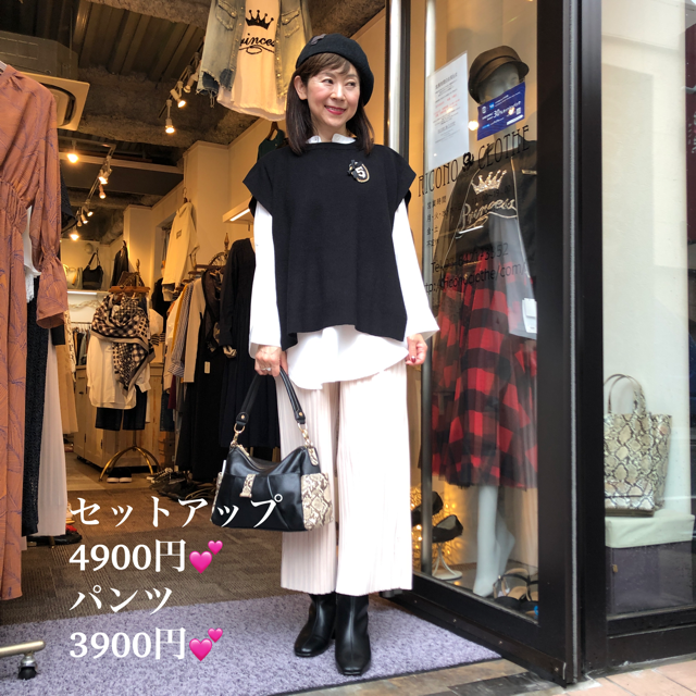 セットアップ💕4900円 今年も出ました💕 チュニックブラウスとニットのセットアップです🍀こちらは、セットで4900円😍 リブプリーツのパンツ3900円も一枚あると大変便利ですよん セットアップは、グレーのベストもございます また、パンツは、アイボリー 、カーキ、ベージュ、ブラックの4カラーとなっております お見逃しなくーーー🙌 ブローチ 2900円💕 2020年9月12日
