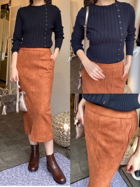 スカート11000円✨ シンプルだけれどとっても使いやすいリブニットに、秋らしいオレンジカラーのタイトスカート🧡 リブニットは伸縮性がありとっても着心地が良いですよ✨ スカートも後ろがゴムで楽ちんです❣️❣️ スカート¥11000 ブーツ¥11000 バッグ¥12000 2020年9月17日