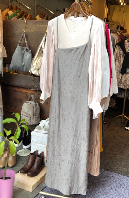 キャミワンピースコーデ💕 グレイッシュカーキのカラーがとってもお洒落なキャミワンピースが入荷しております💕 ミルクベージュのお袖シフォントップスと合わせたコーデはいかがでしょうか? ブラックのキャミワンピースが多い中で、こんなフェミニンなカラーは珍しいです 華やかでクールなイメージですね💕 ワンピース 9000円 トップス 8000円 2020年9月21日