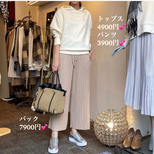 リラックスワンマイルスタイル💕 すっかり冷えこむ今週は、少し暖かいトップスが欲しくなりますね。 洗って直ぐに着られて、おしゃれなデザイン💕💕💕 ストレッチのプリーツパンツは、ヒップの肉感を拾わずに、サラサラの着心地で、驚きの3900円⭐️⭐️⭐️ こちらのベージュの他に、アイボリーとブラックがございます😍 パンツの着丈が長すぎないので、小柄な方にもおすすめのパンツです🙌 大人気の為再入荷しました。 遠方の方はご配送も承りますのでお気軽にお申し付け下さいね💕💕💕 2020年10月15日