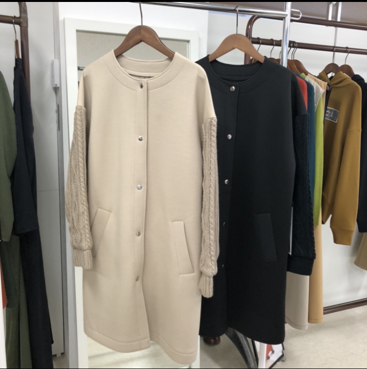 軽量ポリエステル素材のノーカラーコートは、お袖をケーブルニットで切り替えたデザインがとても素敵です💕
