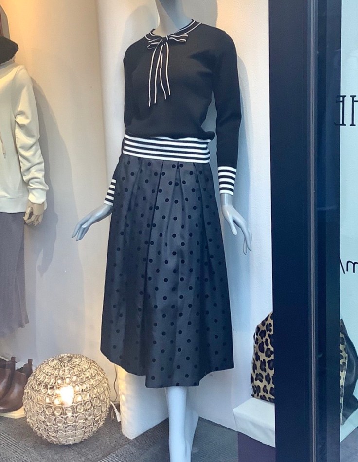 ボウタイニット❎ドットスカート クラシックなボウタイニットと、ドットプリントのふんわりギャザースカートのコーデはいかがでしょうか? リボンとウェストのストライプが着こなしのアクセントになってとても素敵です💕 ニットは非ウール素材で、とても良い着心地です💕 ニット 5900円 スカート 13800円 2020年10月24日