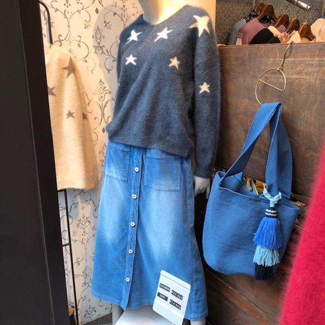 星ニットとデニムスカート💕 フワッフワーーーのラクーン100%ニットと、デニム調ストレッチベロアのスカートのコーディネートはいかがでしょうかーーー? めちゃ可愛くて履きやすい😍💕 ベルトループありで、バックウェストがゴムなので、お腹周りもスッキリして楽チンですーーー お腹が出ているのが悩み💦💦💦 という方にも、かなりスッキリと着られる夢のスカートです👌 限定数のみですので、気になる方はお早めにゲットして下さいね❗️ ニット 23000円 スカート 14800円 2020年12月3日