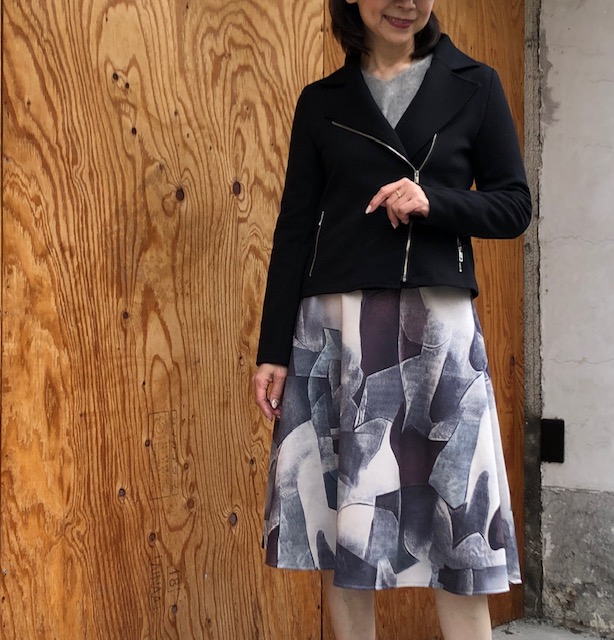 ストレッチライダースジャケット💕16000円💕 ポンチ素材のストレッチライダースジャケットとプリントフレアスカートのコーディネートはいかがでしょうか? いよいよ寒くなってきたので、こんなスカートならロングブーツも、素敵かなー💕 皆様のお越しをお待ちしておりますーーーー ライダースジャケット 16000円 スカート 11000円 2020年12月3日