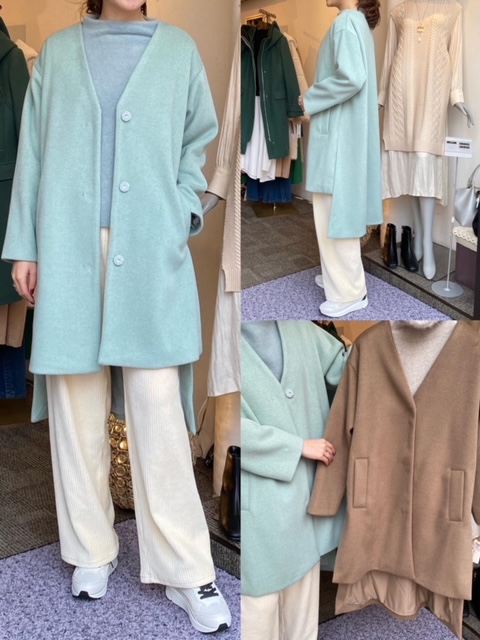 コート¥14000💕 綺麗なパステルカラーのコートか入荷しております☺️💕 ノーカラーで首元がすっきりしており、タートルネックなどにもぴったりです✨ 前後差のある丈間もポイント🤗💙 今ならクリスマスセール開催中につき、表示価格よりも20-30%お安くなる商品多数です✨ この機会にぜひいらしてくださいませ❣️ コート¥14000 2020年12月17日