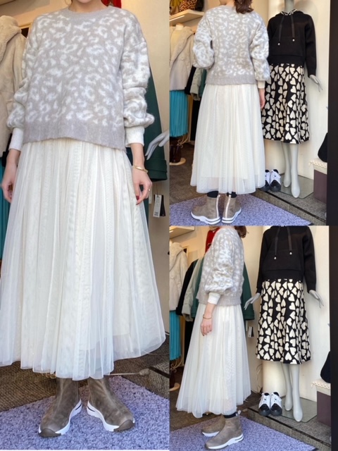 ニット¥13800✨スカート¥13600✨ ウール・モヘア混の暖かニットにチュールスカート💕 ニットは淡いグレーのアニマル柄なので、柔らかい印象で着ていただけます✨ 現在クリスマスセール開催中につき、表示価格より20-30%引きになる商品多数ございますので、皆様ぜひこの機会にいらしてくださいませ🎄🌟 ニット¥13800 スカート¥13600 2020年12月18日