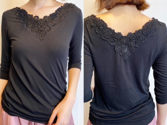 レースカットソー¥5900✨ リコノクローシェ オリジナル商品💕 首元のレースが上品な、インナーとしてもおすすめのカットソーです✨ 伸縮性があって、とっても着心地が良いですよー💕💕 レースカットソー¥5900✨ 2021年2月6日