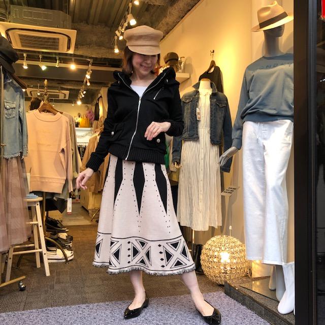 ニットスカート SALE💕¥6000 ちょっぴりエスニックなダイヤ柄のニットスカートがさらにお得になりました💕 ライトベージュの地に黒のダイヤ柄が個性的な一枚💕 着丈も長すぎないから、足捌きも楽チンです⭐️⭐️⭐️ まだまだ着られるお得なスカートが沢山入荷しております お楽しみにですーーー ダイヤ柄がニットスカート ¥6000 星のブルゾン ¥9800 カットシューズ ¥6860 帽子 ¥6500 2021年2月9日