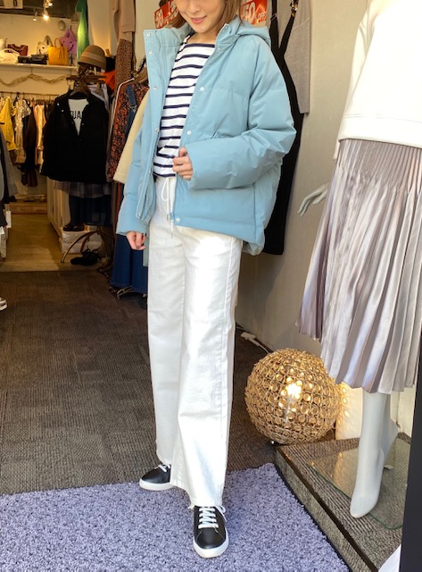 サックスブルー ❎ボーダー 春らしい白パンツが再入荷しました💕 ボーダーのトップスとサックスブルー のダウンコートのコーデで、春らしいのにとっても暖かい💕 2〜3月のお役立ちアイテム ボーダートップス ¥6200 ダウンコート ¥10000 白デニムワイドパンツ ¥13800 2021年2月19日