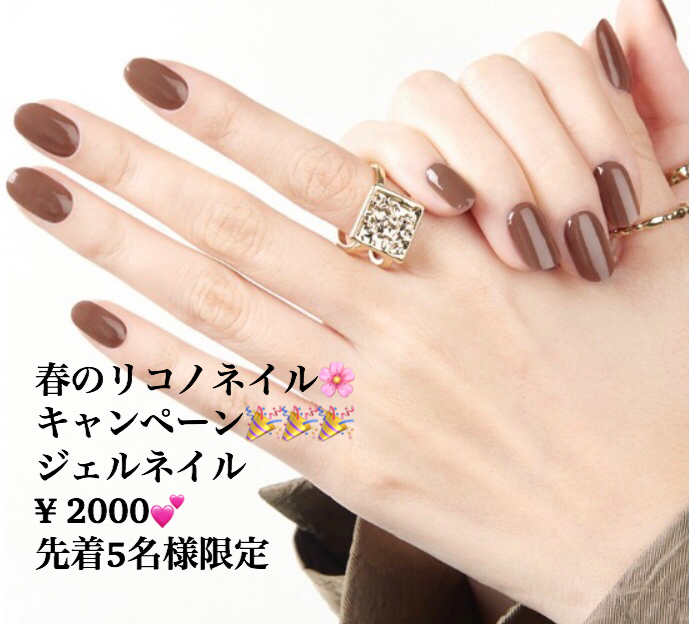 春のネイルキャンペーン💕¥2000 3月よりリコノネイルサービスが変わります💕 リコノクローシェ にお越しいただけるお客様に更に喜んでいただけるネイルサービスをいろいろご用意させて頂きました💕 第一弾は2月28日月曜日に、ワンカラーのジェルネイルを¥2000 外税にてサービスさせて頂きます 先着5名様となりますのでご希望の方は、リコノクローシェ までお電話にてお問い合わせをお願い申し上げます💕😊 素敵な指先で春を始めませんか? ご予約をお待ちしております リコノクローシェ TEL 0364213352 2021年2月20日