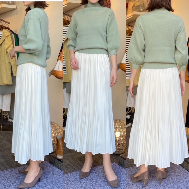 ニット¥6900✨スカート¥15000✨ バルーンスリーブの春色ニットに、ホワイトのプリーツスカート🌸 ニットは伸縮性があって、着心地抜群です✨ スカートのプリーツもとても綺麗でおすすめですよ😊 ニット¥6900 スカート¥15000 2021年2月25日