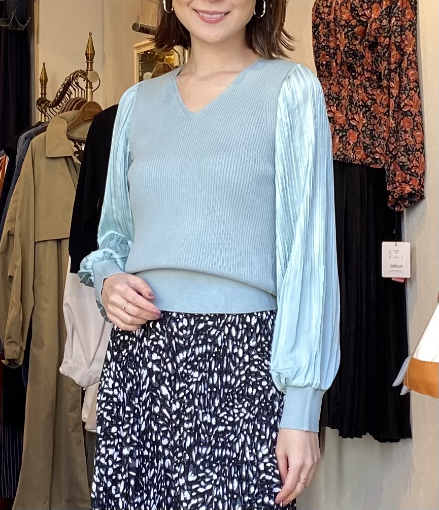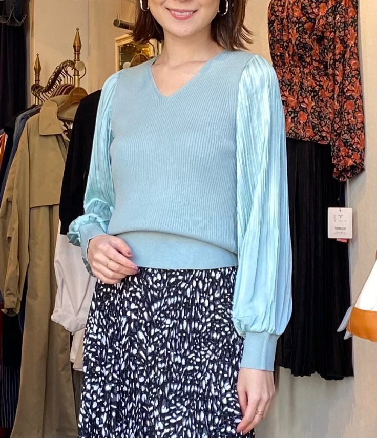 ミントカラーのトップス💕 綺麗なミントカラーが春らしいニットはお袖が細かいプリーツになったデザインとなっております💕 しなやかなニットの素材感と綺麗なサテン生地のプリーツが絶妙な一枚⭐️⭐️⭐️ ミントの他に、アイボリーとブラックがございます サロペットなどのアイテムのインナーとしてもGOOD💕💕💕 デザイントップス ¥8000 2021年2月25日
