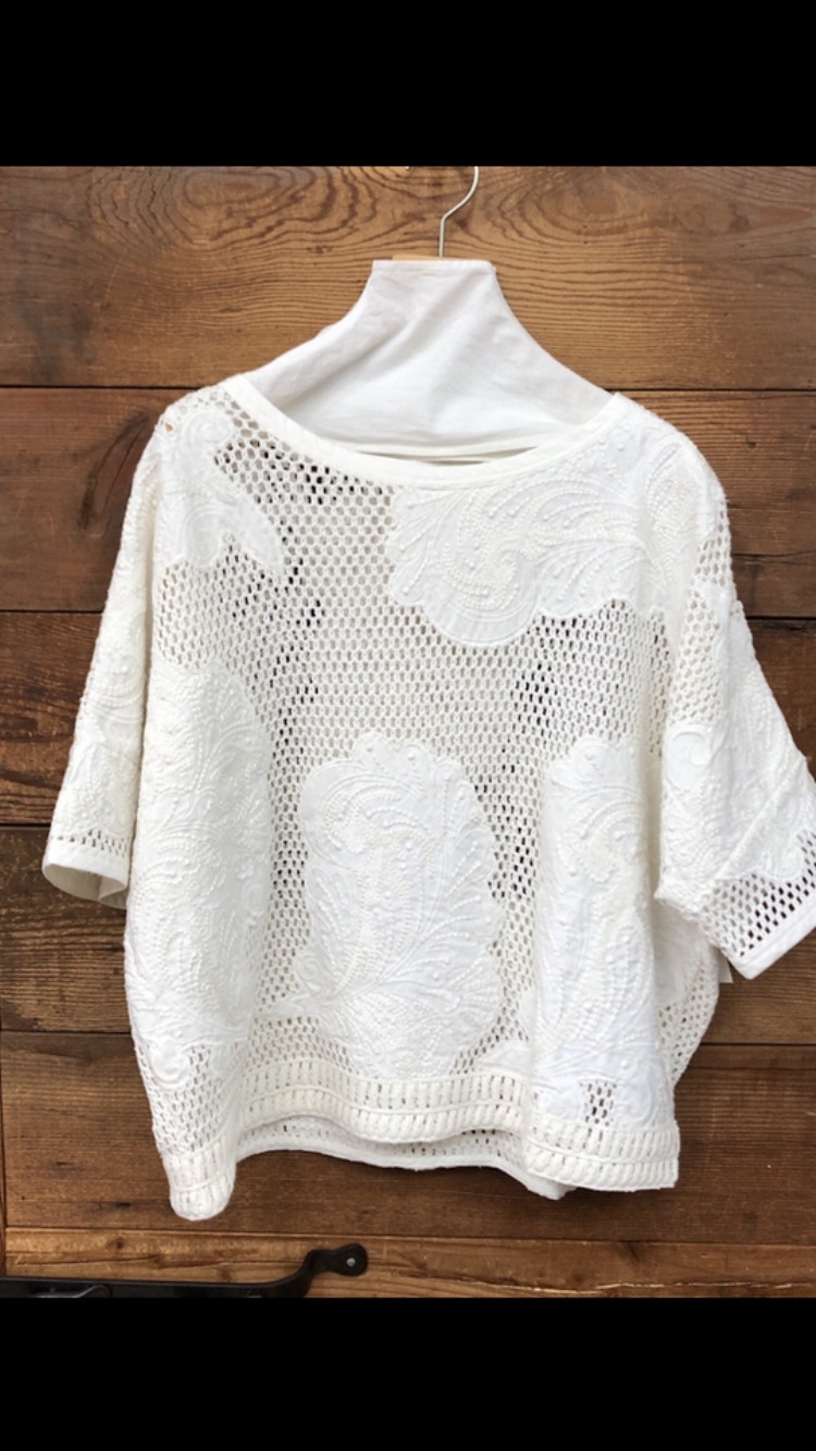 レースモチーフプルオーバー 💕 甘辛ミックスが絶妙なメッシュ生地のデザインプルオーバー が明日入荷となりました💕 こちらのオフホワイトとサンドベージュの各一枚限りの入荷となります💕 小顔&着痩せシルエット💕💕💕 インナーに合わせる、美シルエットのロンT¥2750もご用意しております🥰 春夏のヘビロテアイテムとなりそうです 母の日のプレゼント🎁などにもお勧めの1着です レースモチーフプルオーバー ¥12000🌸 素材 コットン100% 2021年3月5日