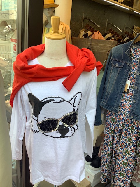 フレンチブルのビジューTシャツ💕¥6400 サングラスをかけたフレンチブルのプリントがキュートな7分袖のカットソーが到着しました💕 真夏も二の腕を気にせずに着られる7分袖は今だけのアイテムになりますよん 2021年3月16日