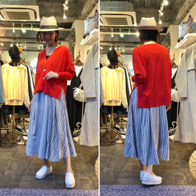 ストライプ切り替えスカート💕 ストライプの生地をフレアに使った配色のスカートがお得なプライスで入荷しました🌸 爽やかで軽くとってもは着心地が良いですよ こちらのベージュの他に、ブラックもございます ストライプ配色スカート ¥8900 カーディガン ¥8900 厚底スニーカー ¥6900 2021年3月19日