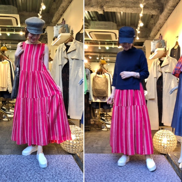マルチストライプのサマードレス💕 今からすぐに使えて、晩夏まで大活躍のサマードレスが入荷しております💕 爽やかなコットン素材のマルチストライプは、なかなか他では見ないお洒落な生地となっております👍 春ニットを重ね着したら、今日みたいな肌寒い日もOK🙆♀️ ローズっぽい赤とネイビーと白が織りなす絶妙なカラーが素敵なのです 他にブルー系とイエロー系がございます ワンピース ¥16000 ニット ¥6900 スニーカー ¥6900 2021年3月20日